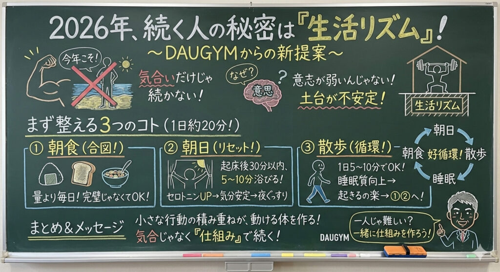 新年のご挨拶 皆さん、明けましておめでとうございます!!本年もDAUGYM京都桂パーソナルジムを、どうぞよろしくお願いいたします 早速ですが、新年を迎えると、こんな気持ちが浮かんでくることはありませんか? 初詣で、今年こ … 続きを読む 2026年もちゃんと続く人は、まず「生活のリズム」を整えている